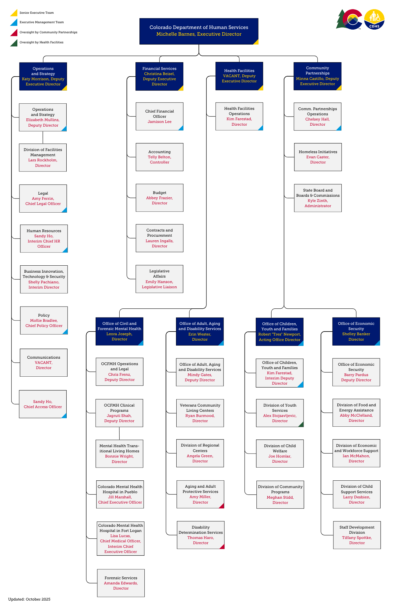 CDHS is comprised of four public-facing offices and several internal-facing offices. Each office is made up of multiple divisions, and the majority of divisions are made up of multiple programs and/or facilities. Expand the sections below for a complete list of offices, divisions, programs and facilities.